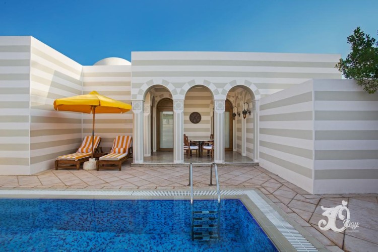 Grand Suite (Private Pool) : These suites with 90 square metres interiors, have a king size bedroom and a marble bathroom with a sunken bathtub and private courtyard views. There is also a living room, a powder room and a fully equipped pantry. Outside, there is a pool