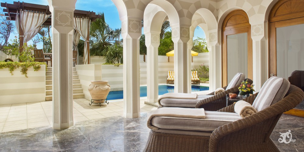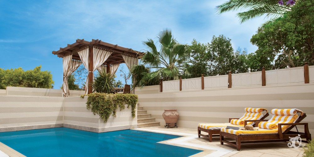 Royal Suite (Private Pool) : -These suites with 90 square metres interiors, have a king size bedroom and a marble bathroom with a sunken bathtub and private courtyard views. There is also a living room, a powder room and a fully equipped pantry. Outside, there is a pool and a canopied dining pavilion for four.